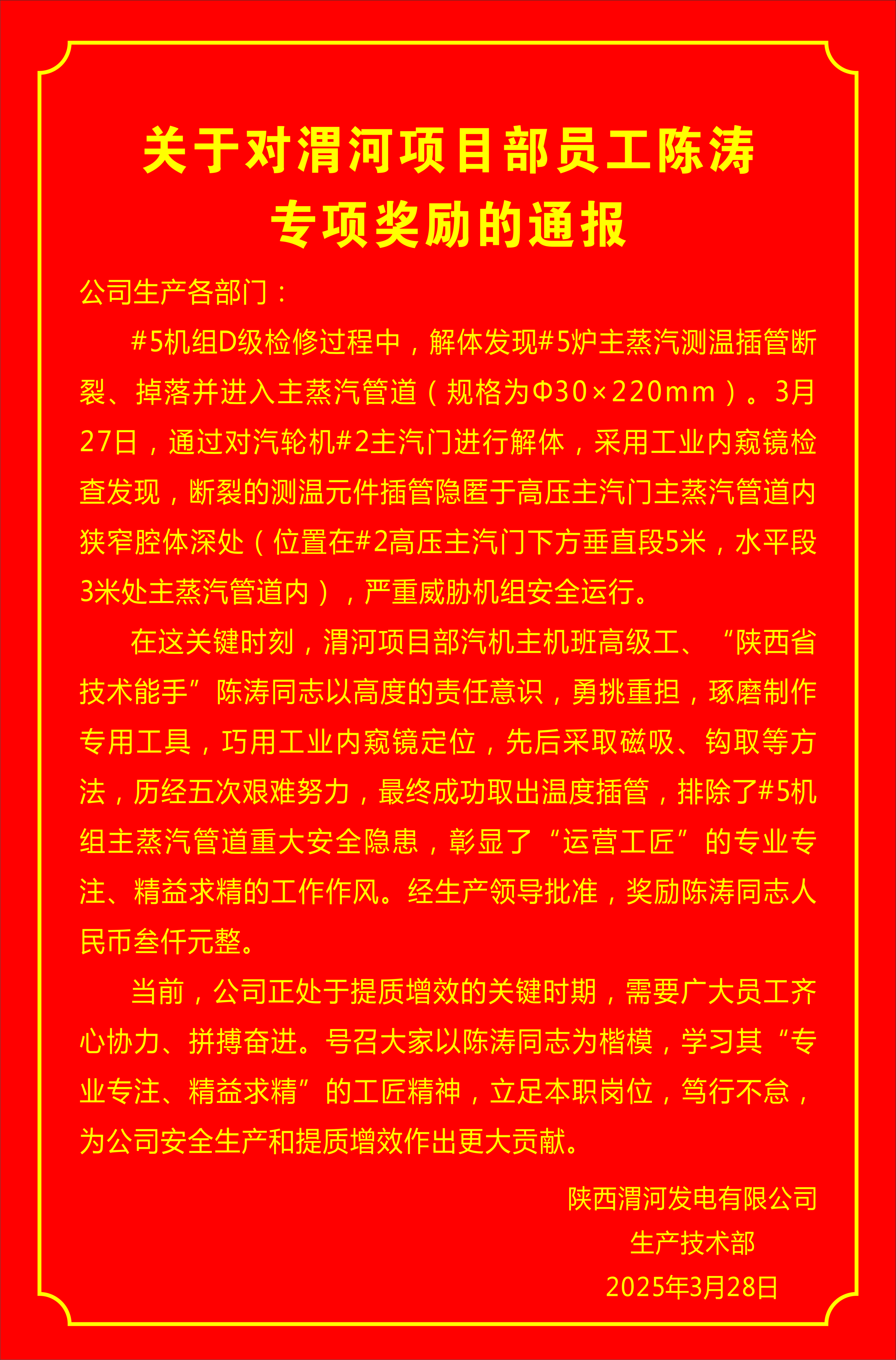近日,一張粘貼在渭河發(fā)電生產(chǎn)樓前的嘉獎(jiǎng)專項(xiàng)通報(bào)吸引著過往員工的目光,成為大家紛紛熱議的焦點(diǎn)。