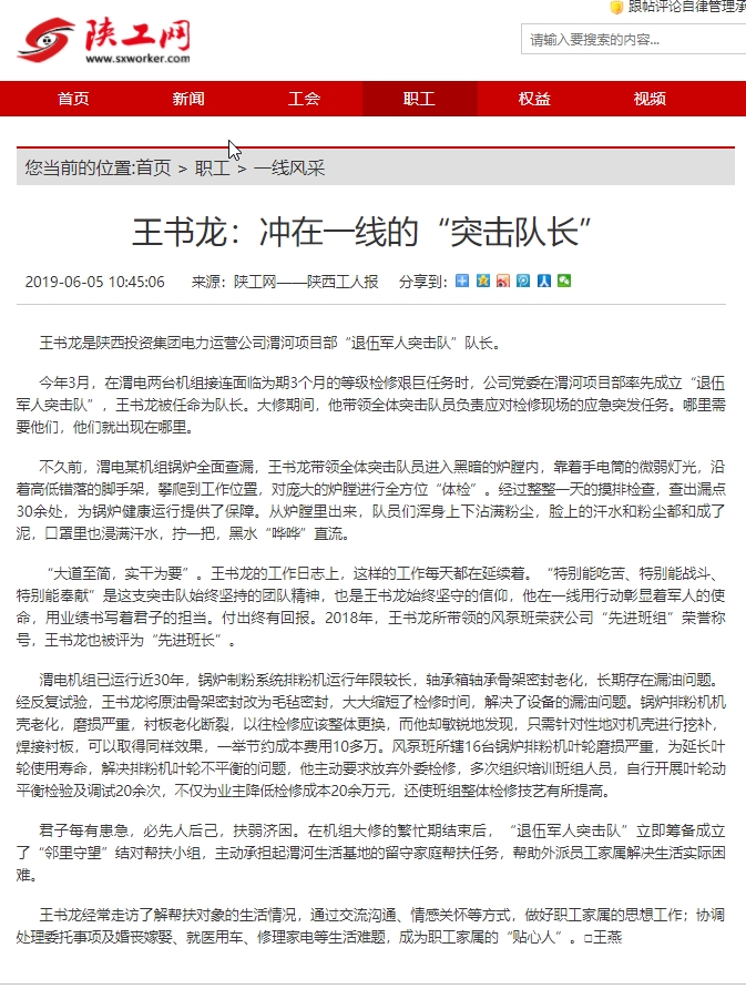 王書龍是陜西投資集團(tuán)電力運(yùn)營(yíng)公司渭河項(xiàng)目部“退伍軍人突擊隊(duì)”隊(duì)長(zhǎng)。
